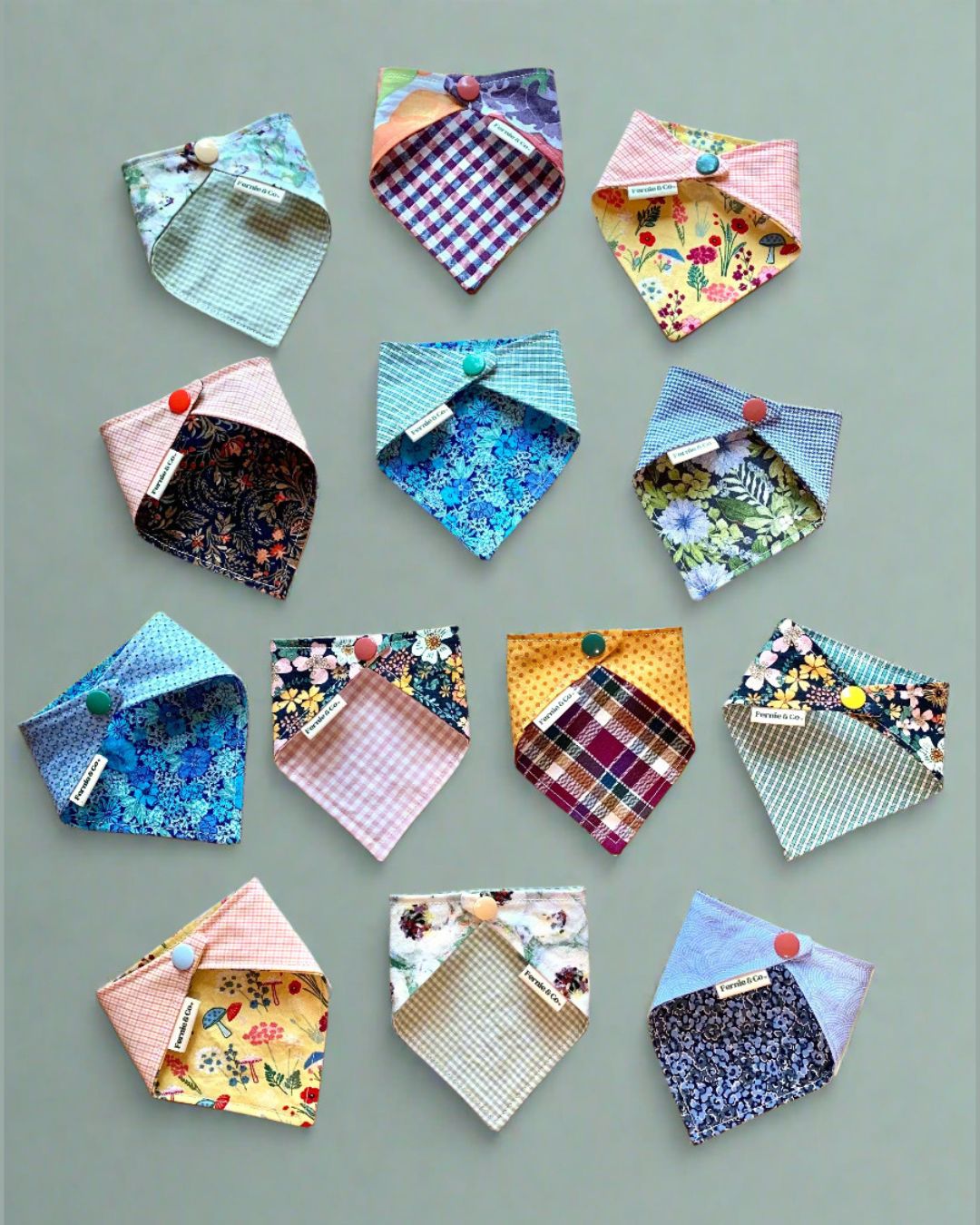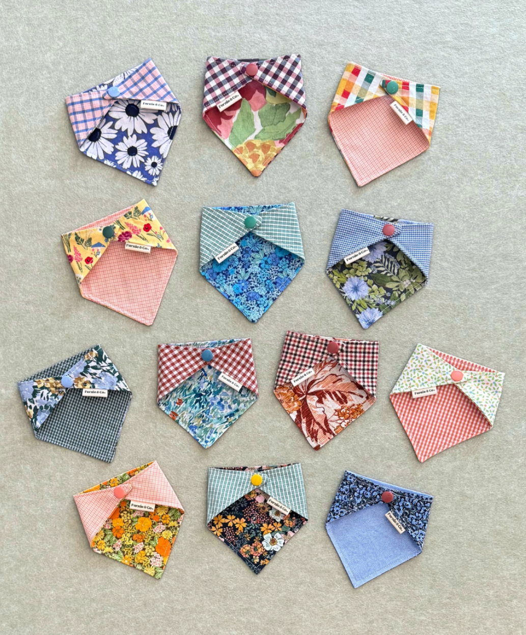 At Fernie & Co., we create all of our products with sustainability in mind. Our pet bandanas are thoughtfully curated with 50%-100% repurposed cotton fabric which has been double washed with an unscented, gentle detergent. They feature a strong resin snap and a double-stitched design to increase durability as well as offer two fabric patterns for reversibility. We hope our bandanas bring you joy and reflect your pet's unique style and personality!