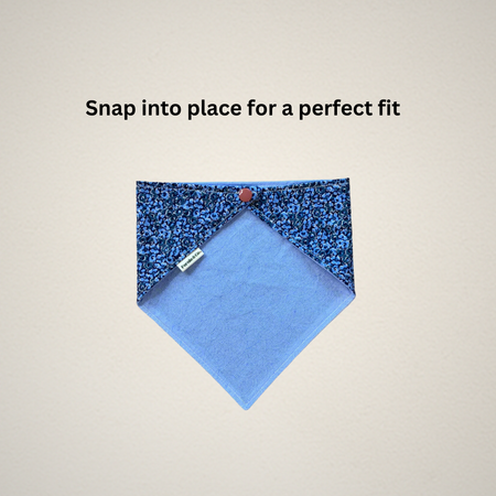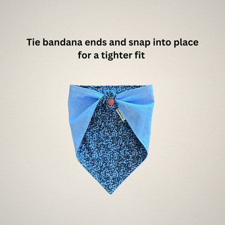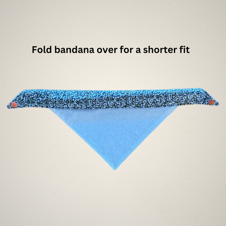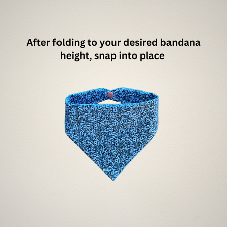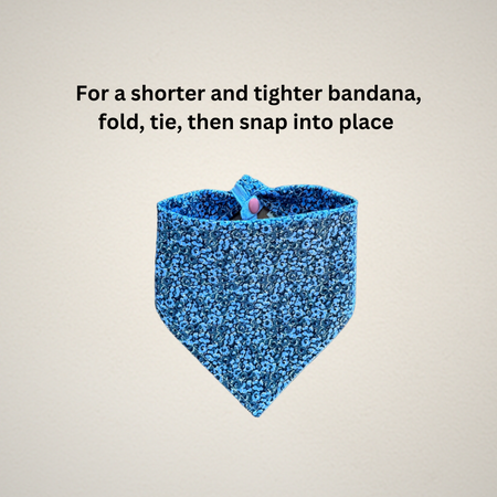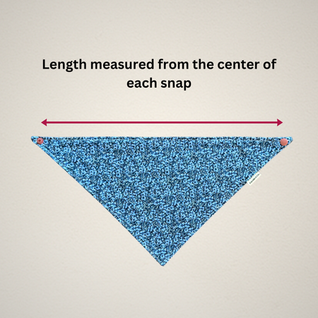 Each bandana size is measured from the center of each snap. For accurate sizing, please measure your pet's neck before purchase. If they are between sizes, we recommend ordering a size up, as you can tie the bandana ends and snap them into place for a tighter fit. If you would like a shorter look to your bandana, simply roll/fold the top of the bandana as many times as desired and snap into place.